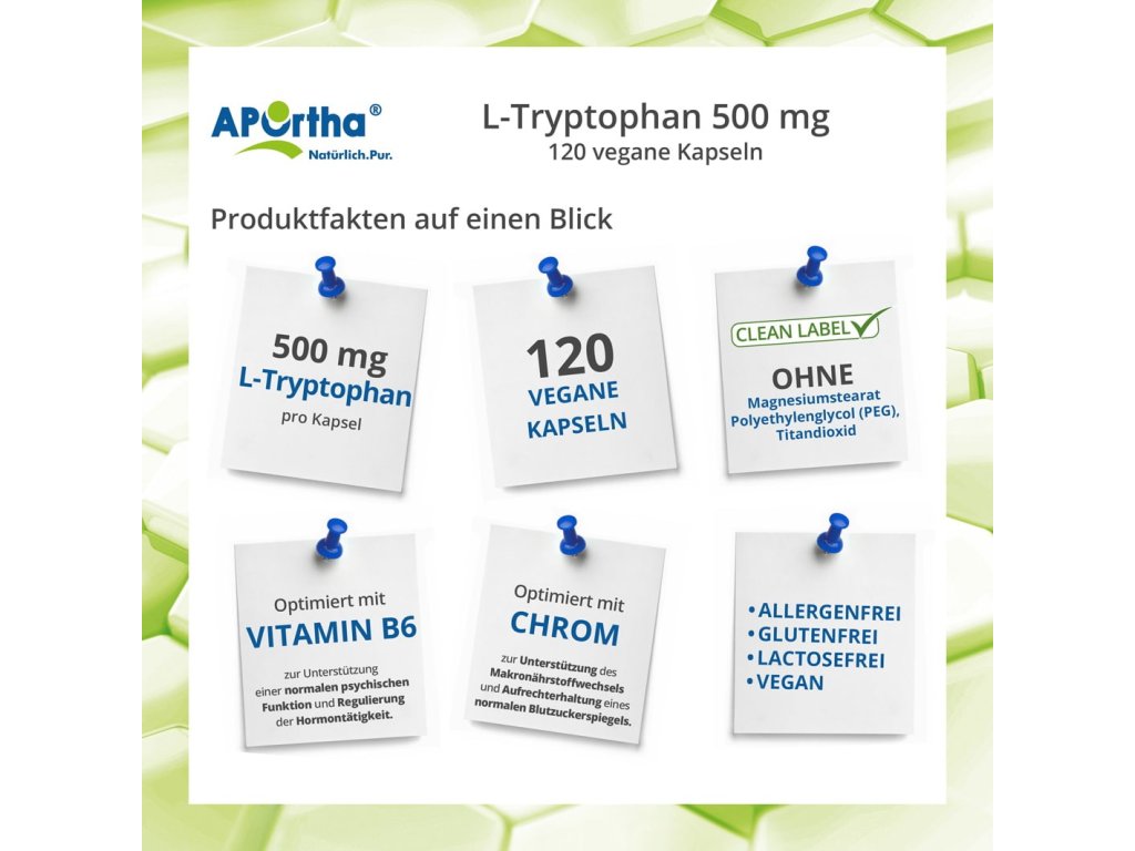 Kapsle L-tryptofanu 500 mg od APOrtha® obsahují esenciální aminokyselinu L-tryptofan doplněnou o vitamin B6 a stopový prvek chrom. Tato kombinace spojuje tři důležité živiny v jedné kapsli a umožňuje jednoduché a přesné dávkování bez nutnosti složité přípravy.