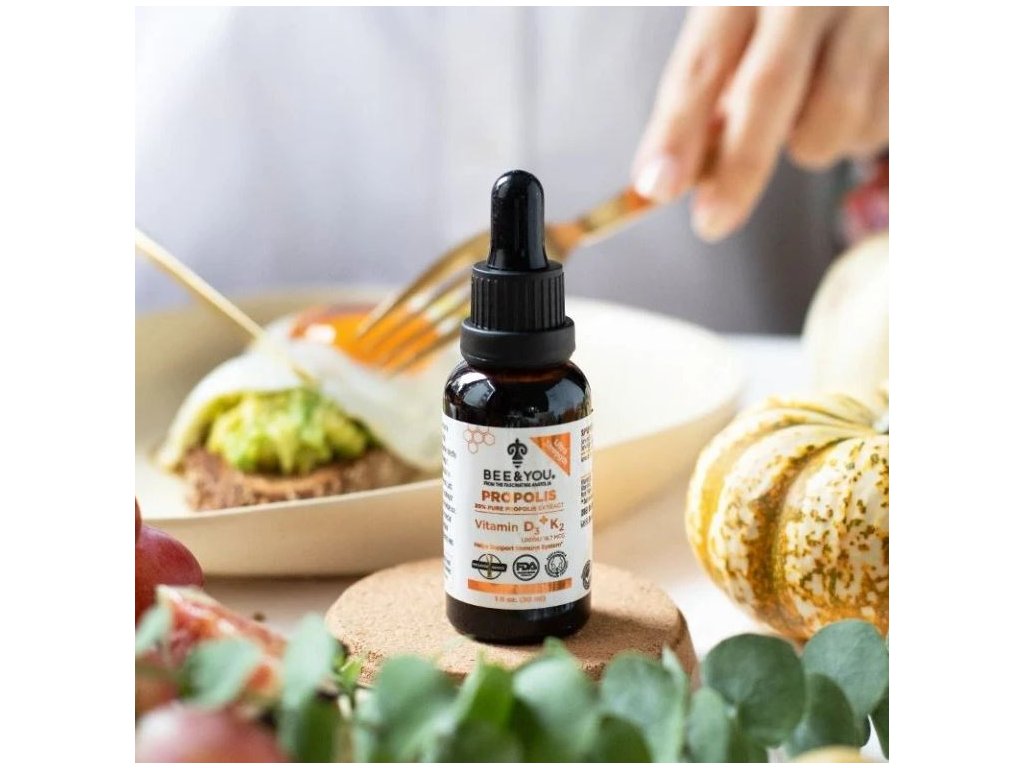 Propolis je přírodní látka bohatá na bioaktivní sloučeniny, jako jsou flavonoidy a polyfenoly, které jsou ceněny pro své antioxidační vlastnosti. Vitamin D3 přispívá k normální funkci imunitního systému a pomáhá udržovat normální stav kostí a svalů. Vitamin K2 podporuje normální srážlivost krve a přispívá k udržení zdravých kostí.