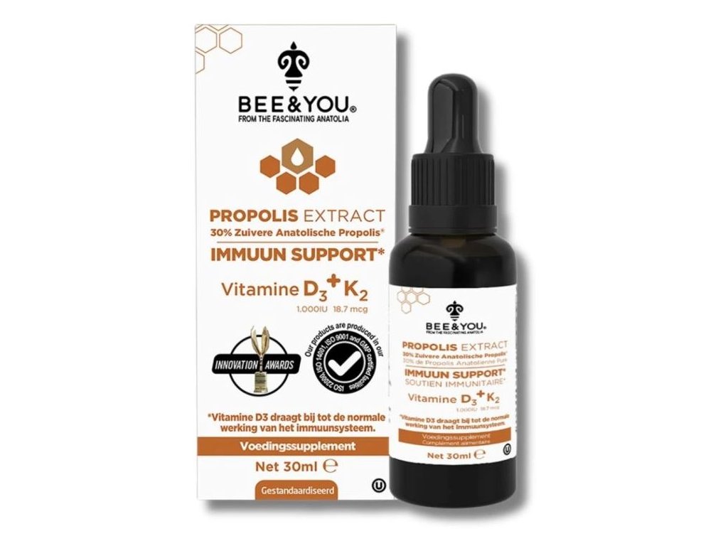 Bee&You propolisový extrakt obsahuje 30 % propolisu, což zajišťuje silnou podporu imunitního systému. Propolis je známý svými antibakteriálními a antivirovými vlastnostmi, které pomáhají chránit tělo před infekcemi a záněty.