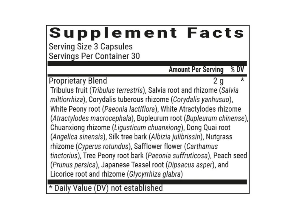 Ovocný plod trblika obecného (Tribulus terrestris), kořen a oddenek šalvěje červené (Salvia miltiorrhiza), hlíza corydalisu yanhusuo (Corydalis yanhusuo), kořen bílé peonie (Paeonia lactiflora), oddenek bílého atractylodu (Atractylodes macrocephala), kořen bukvice čínské (Bupleurum chinense), oddenek chuanxiongu (Ligusticum chuanxiong), kořen anděliky čínské (Angelica sinensis), kůra stromu svíce albízie (Albizia julibrissin), oddenek nutgrass (Cyperus rotundus), květ šafránu barvířského (Carthamus tinctorius), kůra kořene stromové peonie (Paeonia suffruticosa), semínko broskvoně japonské (Prunus persica), kořen a oddenek lékořice pravé (Glycyrrhiza glabra).