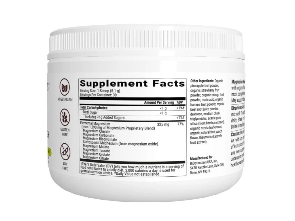 BiOptimizers Magnesium Breakthrough – prémiový komplex 8 forem hořčíků s příchutí Hořčíkový nápoj v prášku, 325 mg na porci, bez přidaného cukru