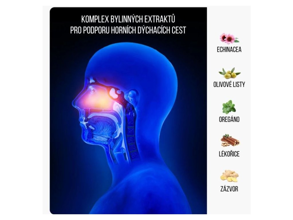 Pro efektivní obranu horních cest dýchacích jsme zařadili extrakty z echinacey, olivových listů, oregana, lékořice a zázvoru. Tyto rostliny jsou známé svým bohatým obsahem antioxidantů, které nejen posilují imunitní systém, ale zvláště podporují zdraví sliznic. Navíc jsme do každé kapsle přidali kurkumu. Rostlinu podloženou stovkami studií, které potvrzují její prospěšné účinky na zdraví a imunitní funkce, včetně podpory odolnosti dýchacího systému.