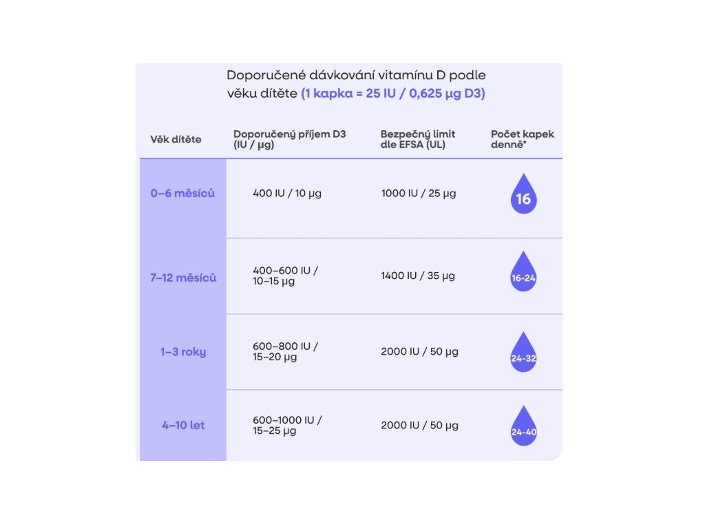 Díky přesnému dávkování po jednotlivých kapkách je tento doplněk vhodný i pro malé děti – včetně kojenců – jako alternativa běžně doporučovaných vitamínů D. Dávkování vždy přizpůsobte věku dítěte a konzultujte s pediatrem.