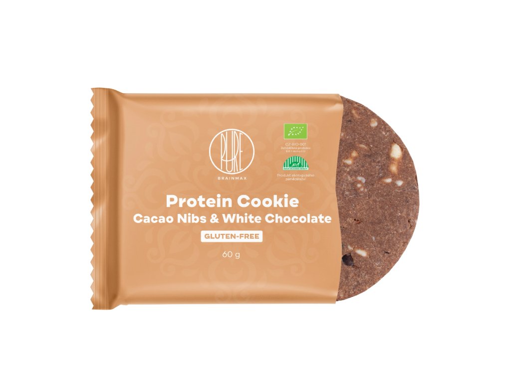 BrainMax Pure Protein Cookie, Kakaové boby & Bílá čokoláda, BIO, 60 g Proteinová sušenka s kakaovými boby a bílou čokoládou / *CZ-BIO-001 certifikát