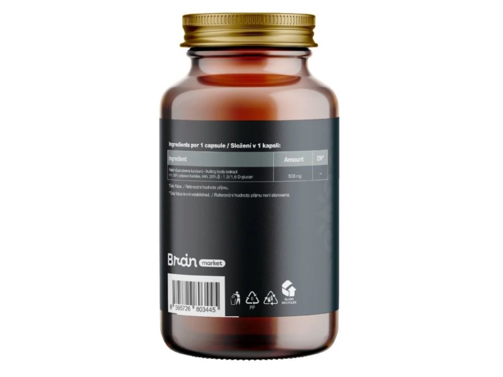 Složení: Extrakt z plodnice Reishi (Lesklorka lesklá, Ganoderma lucidum), rostlinná kapsle na bázi HPMC. Vhodné pro vegany.