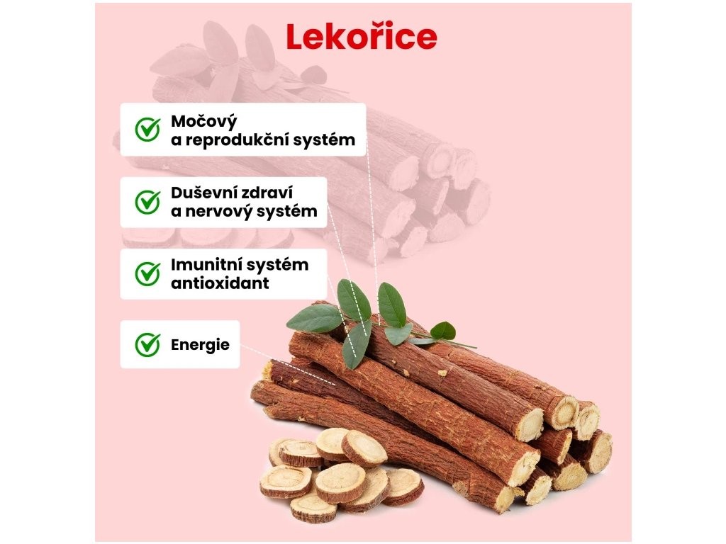 Lékořice je bylina, která obsahuje látku zvanou glycyrrhizin. Díky tomu může lékořice podporovat nejen duševní zdraví, ale také přispívat většímu množství energie a díky svým vlastnostem pomáhá lépe navodit pocit klidu. Má také schopnost podporovat normální funkci metabolismu, což může být přínosné pro ženy, které chtějí hubnout.