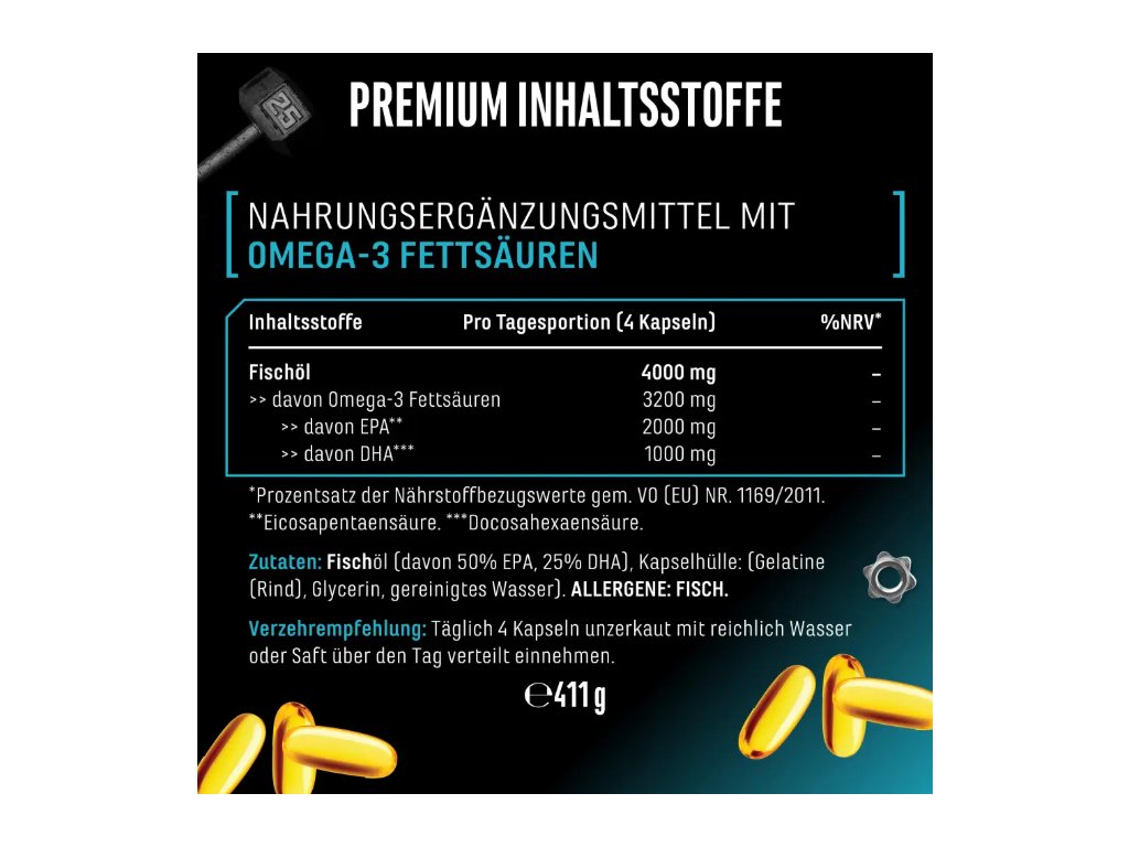 Každá kapsle obsahuje 1 000 mg rybího oleje v přirozené triglyceridové formě, která je v přírodě běžná a patří mezi nejžádanější formy omega-3 v doplňcích stravy. Z toho tvoří 800 mg omega-3, konkrétně 500 mg EPA a 250 mg DHA, díky čemuž produkt nabízí vysoký obsah aktivních látek v každé dávce. Při doporučeném užívání 4 kapslí denně získáte 2 000 mg EPA a 1 000 mg DHA, což představuje praktický způsob, jak podpořit každodenní příjem omega-3 z jednoho produktu.