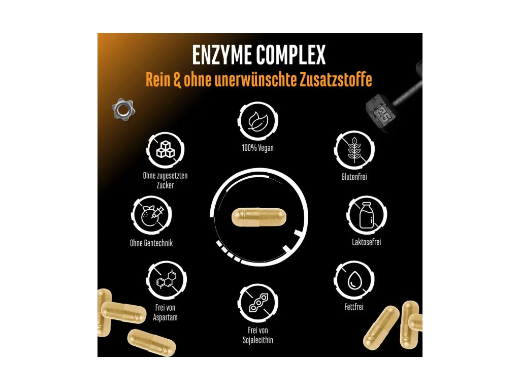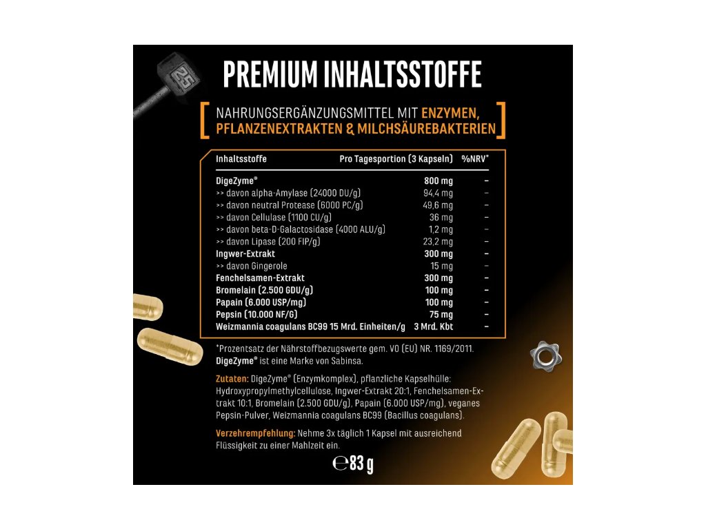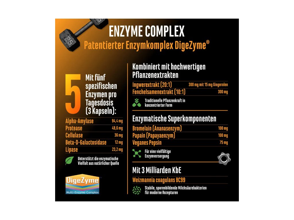 - 800 mg DigeZyme® - patentovaný multienzymový komplex s pěti klíčovými enzymy: (Alfa-amyláza - rozklad sacharidů, Proteáza – štěpení bílkovin, Celuláza – rozklad vlákniny, Beta-galaktosidáza – pomoc při trávení laktózy, Lipáza – štěpení tuků)