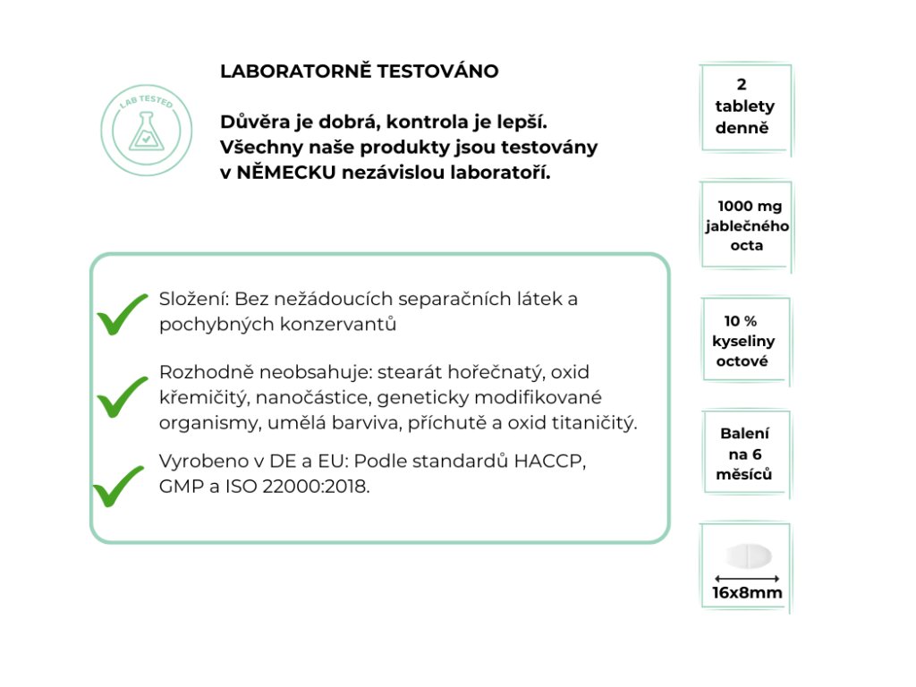 - Bez nepříjemné chuti: Na rozdíl od ostré kyselé chuti tekutého octa se tablety užívají snadno a bez nepohodlí.