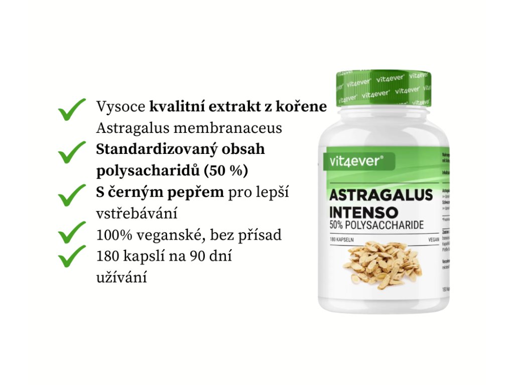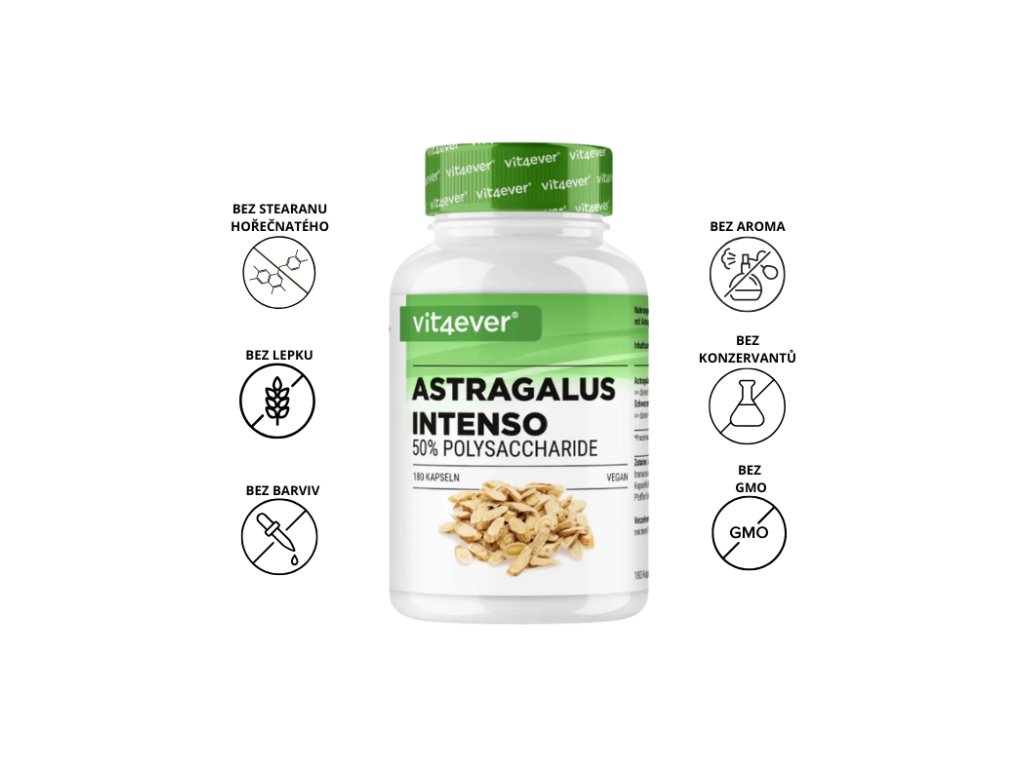 Vit4ever Astragalus Intenso obsahuje přírodní a vysoce kvalitní extrakt, který se získává pouze z kořene Astragalus membranaceus. Ta se vyznačuje zejména vysokým obsahem důležitých sekundárních rostlinných látek jako jsou polysacharidy a saponiny ve formě astragalosidů. Dalšími důležitými složkami jsou flavonoidy (mají antioxidační vlastnosti), minerální látky a aminokyseliny.
