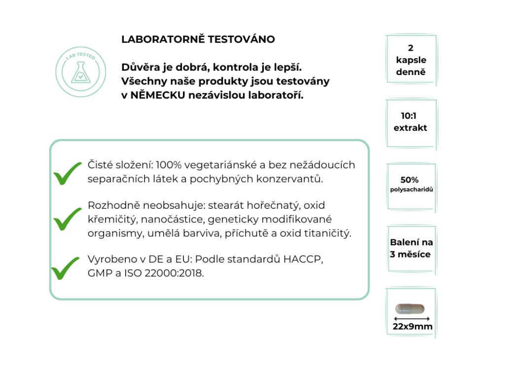Složení: Extrakt z kořene Astragalus 10:1 (Astragalus membranaceus Moench, obsahuje 50 % polysacharidů), extrakt z černého pepře (z toho 95 % piperin), rostlinná kapsle na bázi HPMC.