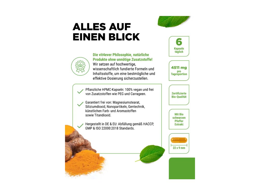 Naše kapsle kurkuma jsou vyráběny podle evropských standardů kvality (DIN EN ISO 9001 a koncept HACCP) a stejně jako u všech doplňků výživy Vit4ever vždy přikládáme velký význam skutečnosti, že se používají pouze přírodní prémiové suroviny s nejlepší biologickou dostupností a tolerancí ve výrobě . Náš kurkumový prášek pochází přímo z Indie.