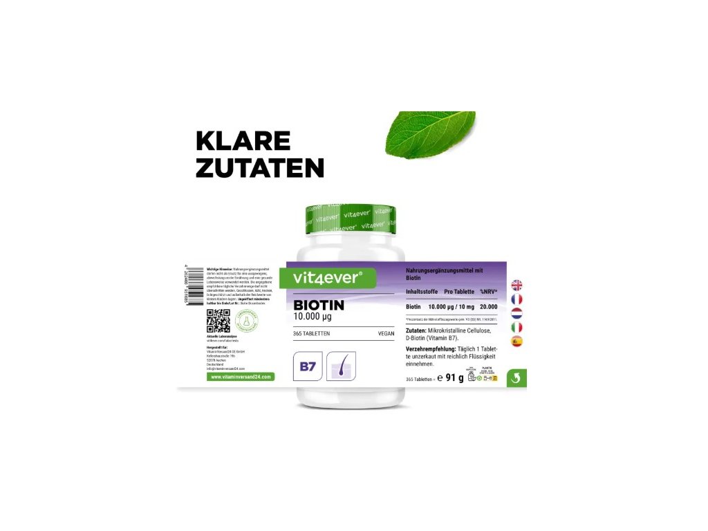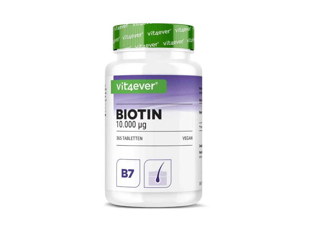Biotin 10 000 μg od Vit4ever je vysoce koncentrovaný veganský doplněk stravy navržený pro cílené doplnění vitamínu B7, známého také jako biotin nebo vitamín H. Každá tableta obsahuje 10 000 μg biotinu v čisté formě, což z produktu dělá praktickou volbu pro všechny, kteří chtějí vědomě podpořit svůj denní příjem tohoto důležitého vitamínu jako součást dlouhodobé péče o vzhled i vnitřní rovnováhu.
