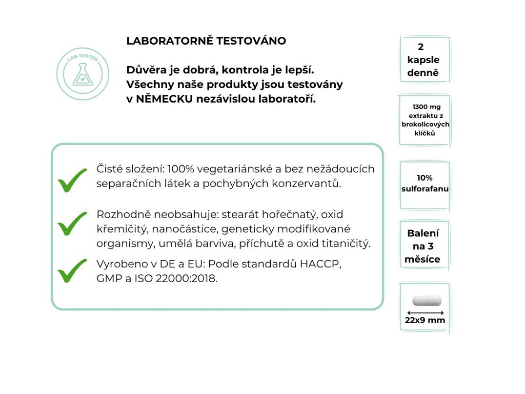Každá kapsle obsahuje 650 mg čistého extraktu z brokolicových klíčků, standardizovaného na 10% sulforafanu. To znamená 65 mg sulforafanu v jedné kapsli a 130 mg v denní dávce dvou kapslí. Tato koncentrace zajišťuje až o 20 až 50 procent vyšší množství účinné látky ve srovnání s běžně dostupnými produkty.