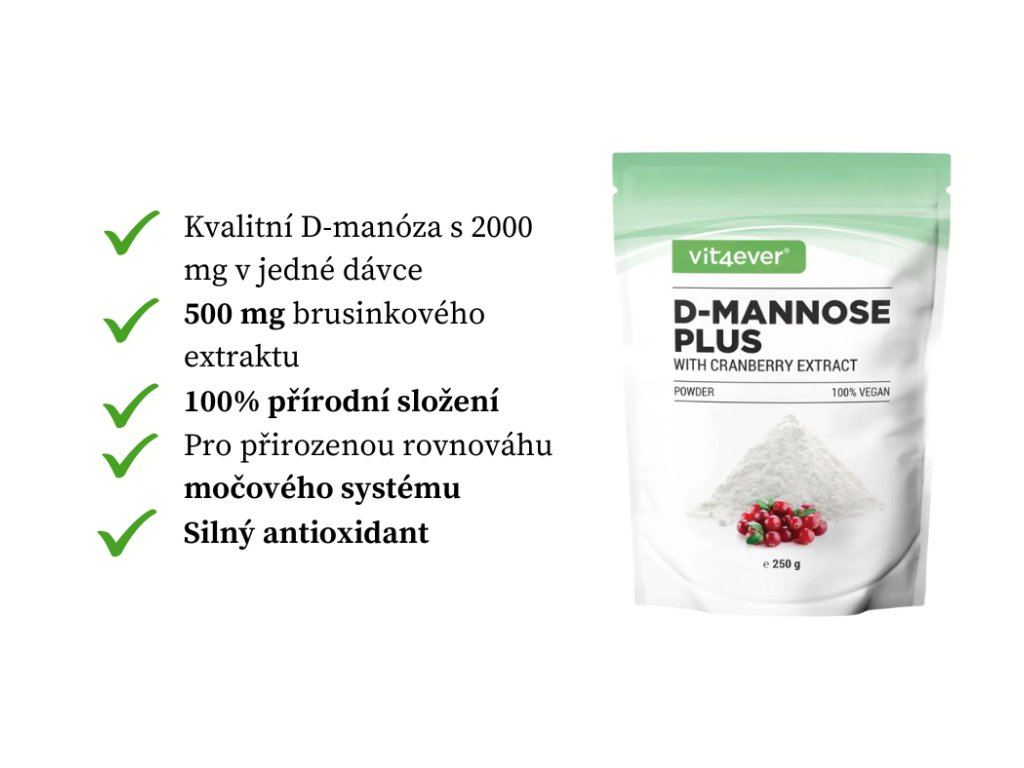 Vit4ever D-Mannose Plus - Manóza s extraktem z brusinek, 250 g přírodní kombinace manózy (2000 mg) a brusinek (500 mg) v práškové formě