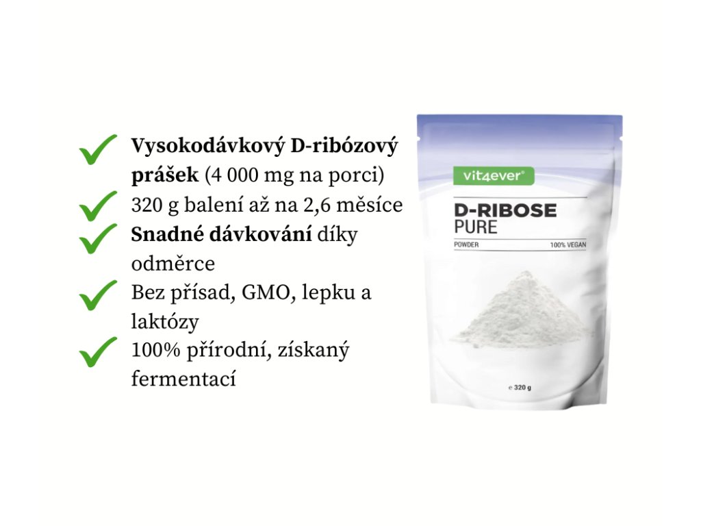 D-ribóza v tomto doplňku stravy je získávána šetrným fermentačním procesem z jednoduchých cukrů. Díky tomu je zcela bez umělých přísad, barviv nebo ochucovadel a zároveň si zachovává svou přirozenou strukturu i vysokou čistotu. Každé balení obsahuje 320 gramů čisté D-ribózy, která vystačí na 80 denních dávek po 4000 miligramech. Praktické balení se znovuuzavíratelným zipem a přiloženou odměrkou usnadňuje každodenní užívání. Prášek se snadno rozpouští a má neutrální chuť, takže ho lze jednoduše přidat do vody, smoothie nebo jiného oblíbeného nápoje.