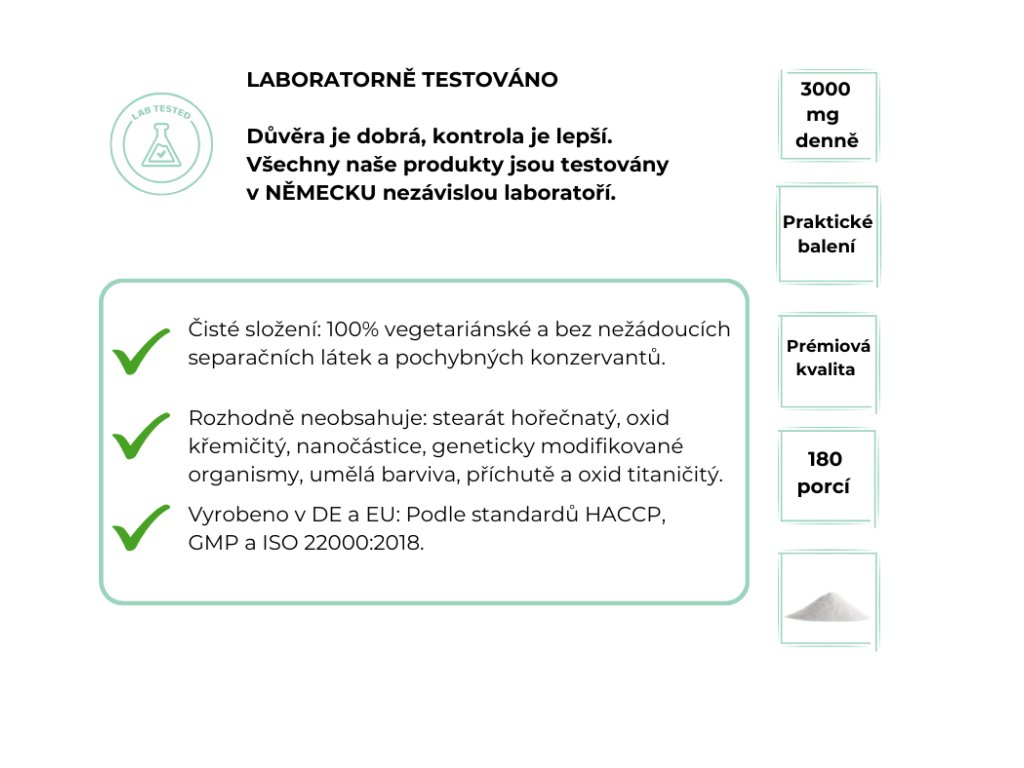 Naše produkty necháváme testovat v nezávislých zkušebních laboratořích na kvalitu a čistotu, stejně jako na obsah účinných látek. Všechny výsledky vám poskytneme ve formátu PDF.