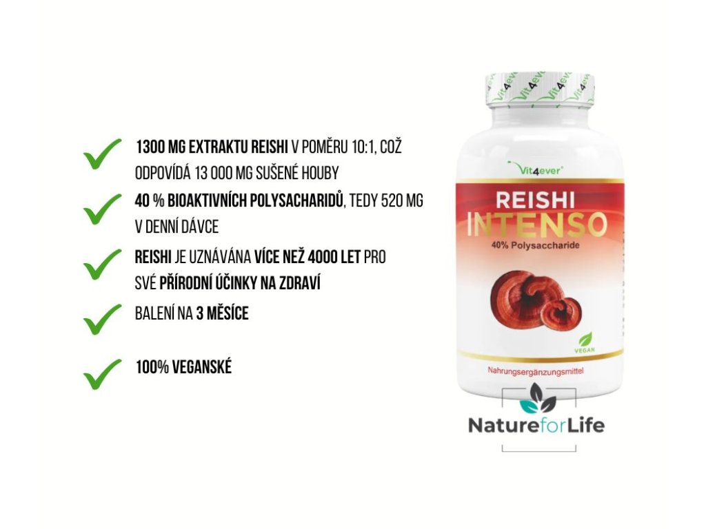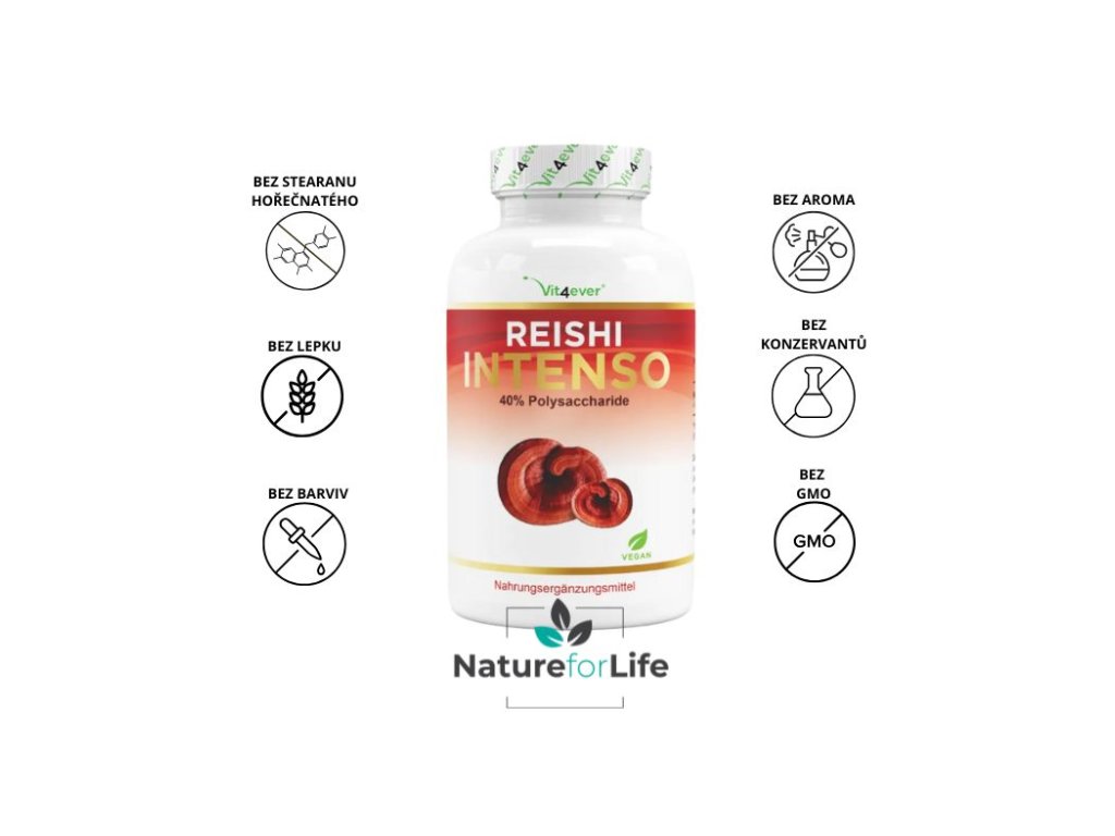 Reishi Intenso od značky Vit4ever obsahuje vysoce kvalitní standardizovaný extrakt z plodnice houby, který je garantován 40 % obsahem bioaktivních polysacharidů. Každá denní dávka 2 kapslí přináší 1300 mg extraktu, což odpovídá přibližně 13 000 mg sušeného prášku.