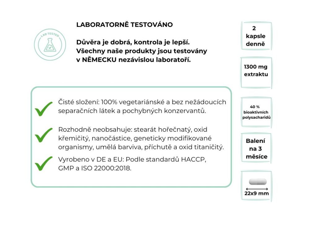 - Laboratorně testováno na obsah polysacharidů a bezpečnost (těžké kovy, plísně, bakterie).