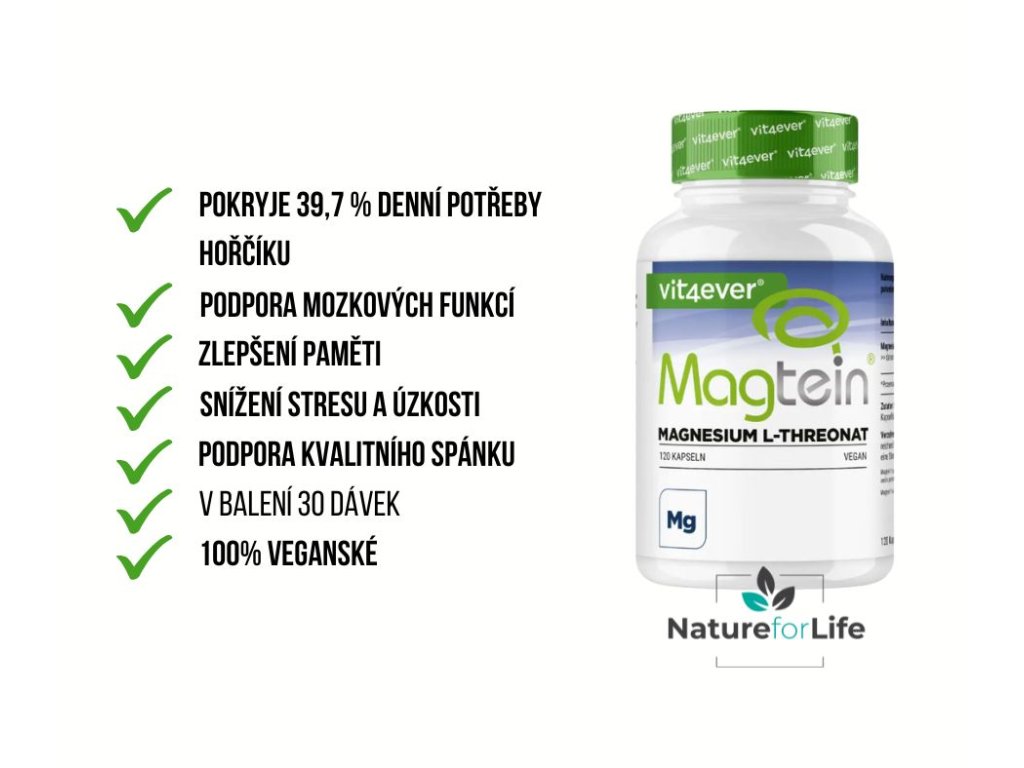 Magtein® je patentovaná sloučenina hořčíku a kyseliny L-threonové. Tento speciální tvar byl vyvinut v USA a vyznačuje se inovativní strukturou. Kombinace byla navržena tak, aby mohla být tělem efektivně absorbována a zpracována. Jedna denní dávka pokryje 39,7 % denní potřeby hořčíku.