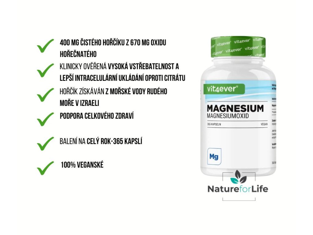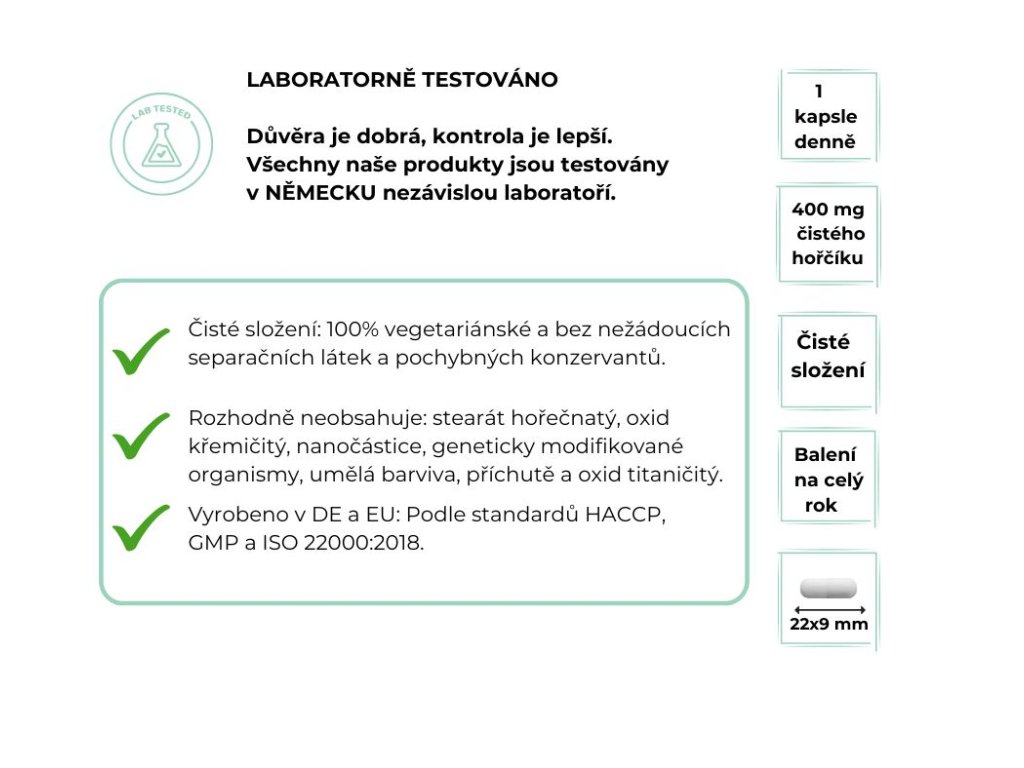 Každá kapsle obsahuje 670 mg oxidu hořečnatého, což odpovídá 400 mg čistého hořčíku – tedy 107 % doporučené denní dávky. Balení s 365 kapslemi vystačí na celý rok užívání. Hořčík je získáván z přírodního zdroje v oblasti Rudého moře a každá šarže prochází laboratorním testováním na kvalitu a čistotu.