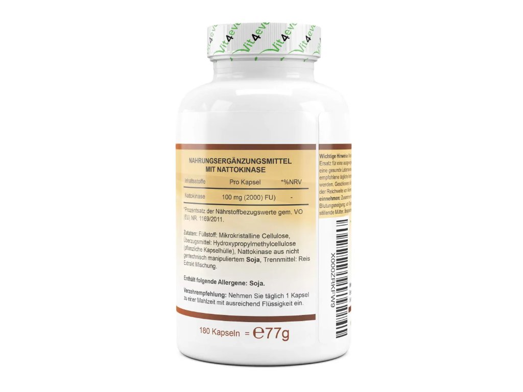 Složení: plnivo: mikrokrystalická celulóza, hydroxypropylmethylcelulóza (skořápka rostlinné kapsle), nattokináza z geneticky nemodifikované sóji, protispékavá látka: směs rýžového extraktu.