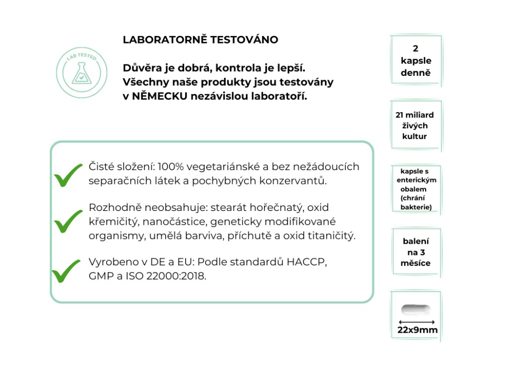 - 21 miliard CFU na denní dávku (2 kapsle), včetně prebiotik.