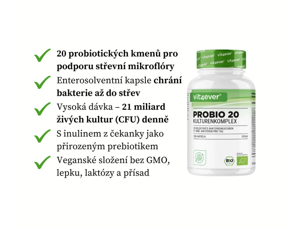 V našich střevech existují stovky různých druhů bakterií, nazývaných také střevní bakterie. Kromě šetrného trávení plní střevní bakterie v našem organismu i další důležité funkce. Pokud již není rovnováha ve střevě přítomna, dochází k narušení organismu a může docházet k nepříjemným potížím a narušení funkce těla. Náš komplex Probio 20 obsahuje velké množství vybraných bakterií mléčného kvašení. Naše komplexní bakteriální kultury Probio 20 jsou vyráběny v souladu s evropskými standardy kvality (DIN EN ISO 9001 a koncept HACCP) a stejně jako u všech doplňků výživy Vit4ever vždy klademe velký důraz na to, aby při výrobě byly použity pouze přírodní prémiové suroviny.