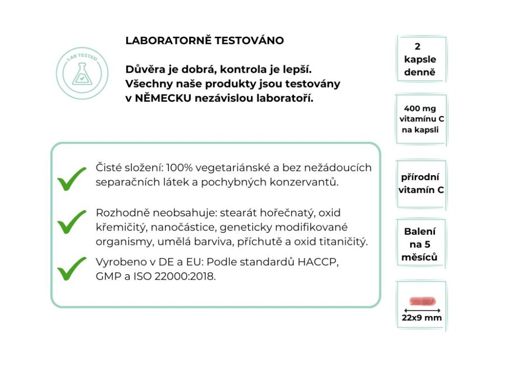 - Bez syntetické kyseliny askorbové, GMO, lepku, laktózy a umělých přísad