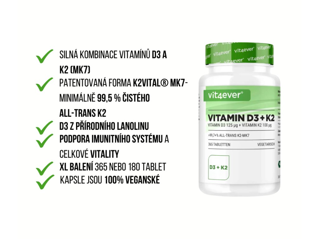 Vit4ever Vitamin D3 & K2 nabízí jednoduchý způsob, jak zajistit, že vaše tělo dostává to, co potřebuje. Náš produkt je vyvinut tak, aby maximalizoval vstřebávání a účinnost těchto dvou základních živin. Není to jen doplněk – je to investice do vašeho zdraví.
