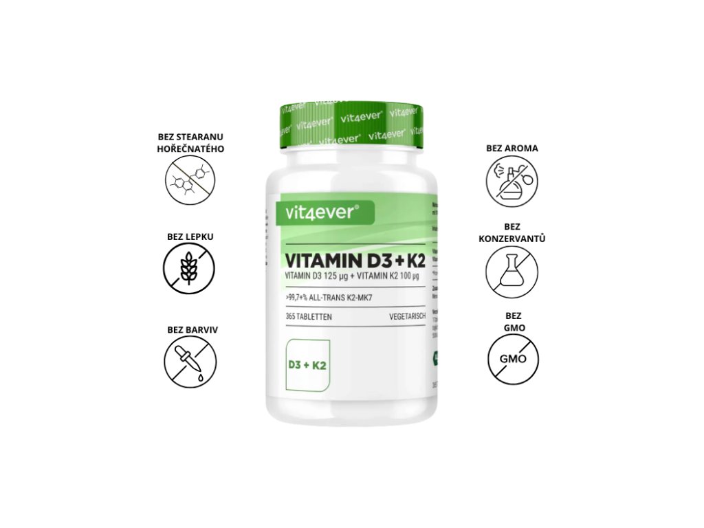 Vit4ever Vitamin D3 + K2 MK7 – 5 000 IU, 100 tablet účinná kombinace D3 (125 µg) + K2 MK7 (100 µg) pro kosti a imunitu